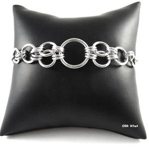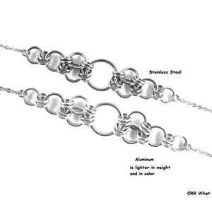 Handcrafted using aluminum chainmail rings woven in a fun, multi-links chain, includes O ring center with smaller rings on each side. Aluminum does not tarnish and is super light weight which is why I love it for anklets.