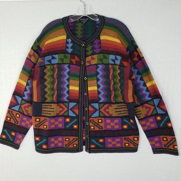 Silver Llama 100% Alpaca Cardigan Sweater Colorful Ethnic Colorblock sz XL Peru