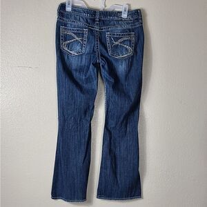 Silver Lola Flare Jeans. GUC, only due to holes, otherwise no obvious flaws. Has holes, but appears to be of distressed style. Tag says size is W29/L31, but these are the actual measurements that I got: waist: about 16 inches, inseam: about 27 inches. I included a photo of the crotch as I need to see that when I buy jeans online.