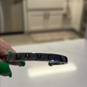 Stylish silver bangle bracelet with 'LOVE' engraving. Perfect for any occasion. Not sterling