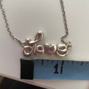 This exquisite silver necklace showcases a beautifully crafted 'Love' pendant in a flowing cursive script, featuring a charming heart in place of the 'o'. The delicate design is suspended on a fine chain, making it a perfect accessory for romantic occasions. Its timeless elegance adds a sophisticated touch to any outfit.