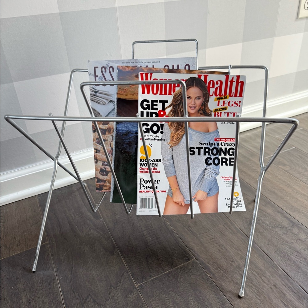 Stylish silver magazine rack. Perfect for organizing your favorite reads. Original mid-century modern design. *magazines for size, staging purposes*