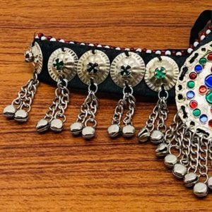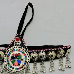 The vintage-inspired headpiece is handcrafted by the natives of Central Asia. It is made up of an adequate quality metal alloy. The black fabric used for making this tribal headpiece is of fine quality and it is beautified with silver coins all over it. This headpiece is one of the most admired pieces from our jewelry collection. The free size of black thread to adjust the headpiece according to your head size.