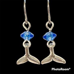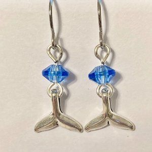 Silver Mermaid Whale Tail Earrings Blue Bead Plated Dangle Dainty Nautical