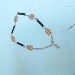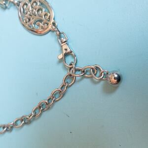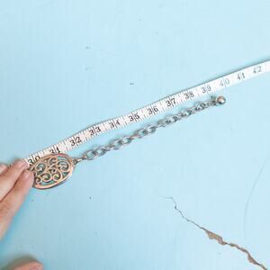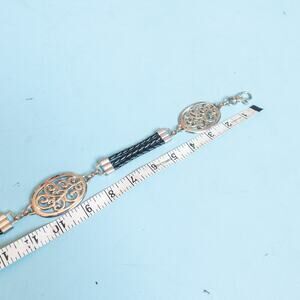 Features: Bright silver metal medallions separated by black braided genuine leather segments with silver chain and adjustable clasp closure.