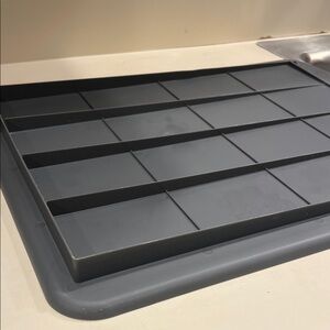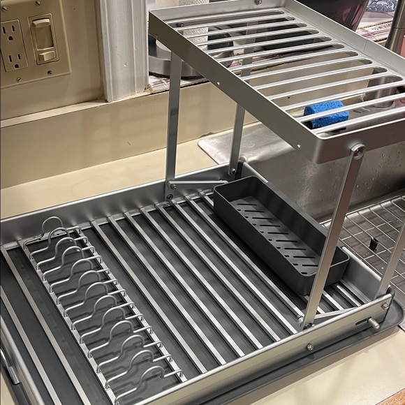 Stylish folding aluminum dish rack with multiple tiers. Perfect for organizing dishes and utensils. Space saving.
