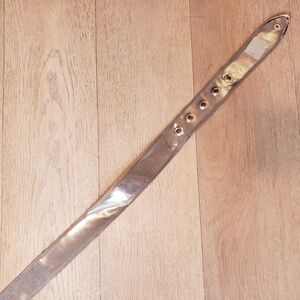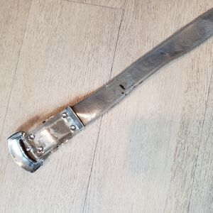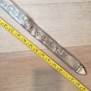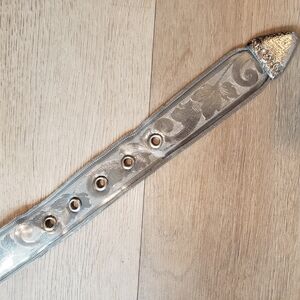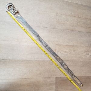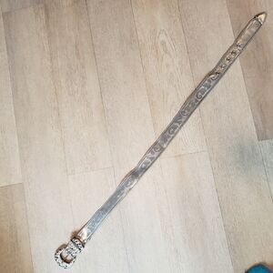 Stylish silver belt featuring a decorative rhinestone buckle. Perfect for adding sparkle to any outfit.