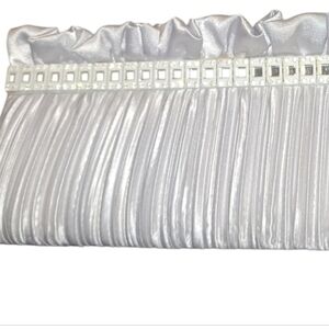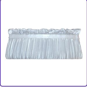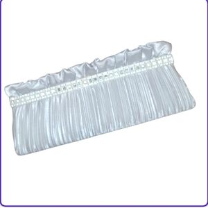 This elegant silver clutch features a long rectangular shape and is crafted from a luxurious satin-like fabric with a lustrous sheen. The pleated texture adds sophistication, while the decorative rhinestone trim along the top edge enhances its glamour, making it perfect for evening occasions.