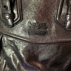 Silver metallic leather Coach purse. Purchased over a decade ago and only used by me. Care card located in the small zipper compartment, inside the bag. No dust bag included.