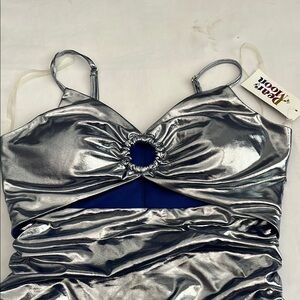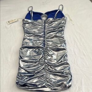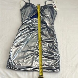 Shimmer in this silver metallic mini dress. Features a ruched design and a stylish cutout.