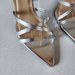 "NEW" Gorgeous Looking Silver Metallic Leather Sandals By BSS Black Suede Studio. Adjustable Ankle Wrap with Rhinestone Buckle, Pointed Toe, Cushioned Foot Bed, Leather Wrapped 4" Heel, Man Made Soles, Made in Brazil,