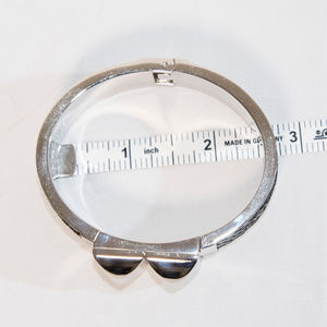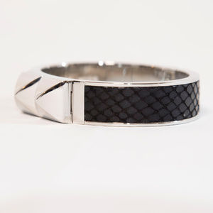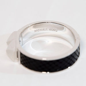 Gently worn, EUC silver Michael Kors hinge bangle bracelet with pyramids and black python sides. Small scratches on the edges as seen in the overhead photos.