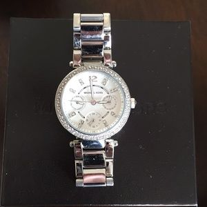 Great watch! Only worn a handful of time. Silver watch with clear crystals around face. Comes in original box with all the links.