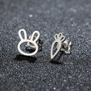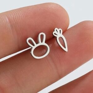 A pair of dainty silver tone mismatched bunny rabbit and carrot stud earrings. Butterfly backings closure. Made of stainless steel. Are approx. 1cm in length; shown next to a penny to help indicate size