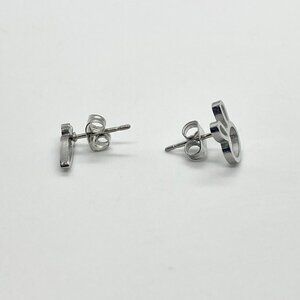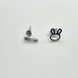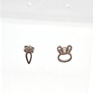 A pair of dainty silver tone mismatched bunny rabbit and carrot stud earrings. Butterfly backings closure. Made of stainless steel. Are approx. 1cm in length; shown next to a penny to help indicate size