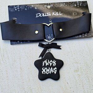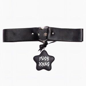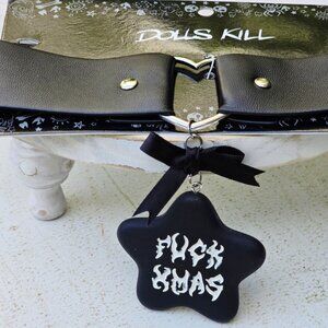 Featuring a bold star pendant etched w/ “F**k Xmas,” crafted in black vegan leather w/ an adjustable strap.