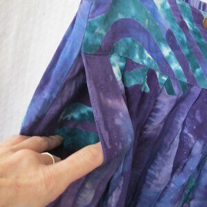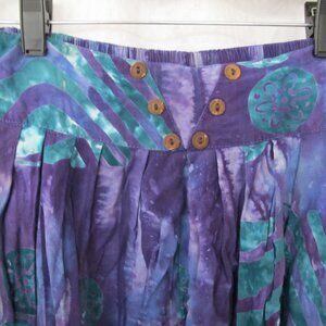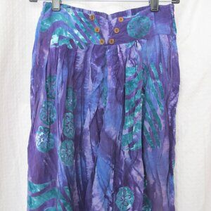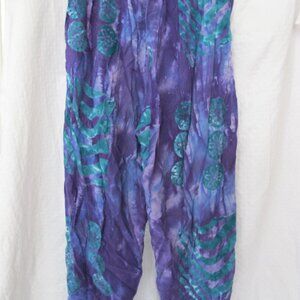 Great preloved condition - Women's Silver Moon Creations Maui Hawaii Boho Style Pants - Size Small. 100% rayon. Purple printed fabric. Elastic back waistband with button detail accents. Pleated loose style with tapered leg with button accents on bottom of legs. Side pockets.