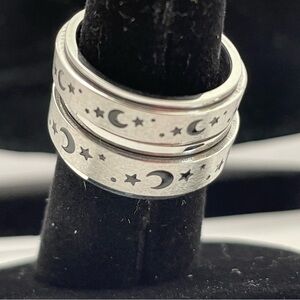 Matching pair of silver stainless steel rings featuring a celestial moon and stars design. With anxiety fidget spinner centers. Sizes 7 and 8. Perfect for adding a touch of whimsy to any outfit.