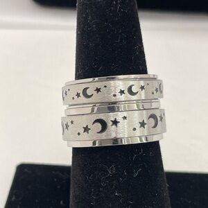 Matching pair of silver stainless steel rings featuring a celestial moon and stars design. With anxiety fidget spinner centers. Sizes 7 and 8. Perfect for adding a touch of whimsy to any outfit.