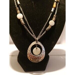 Elevate your fashion game with this stunning Silver 2 strand Beaded Necklace The necklace features two strands of beautiful white Mother of Pearl/Abalone beads, various bead shapes in metals of bronze and silver tones with a hammered silver teardrop-shaped pendant at the center. The lobster clasp closure ensures a secure fit and gives you the flexibility to adjust the length as per your liking.