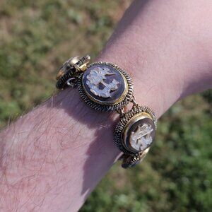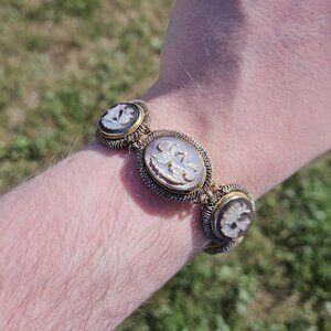 Silver Mother of Pearl Etched Greek Roman Chariots Art Deco Bracelet 7 Inches