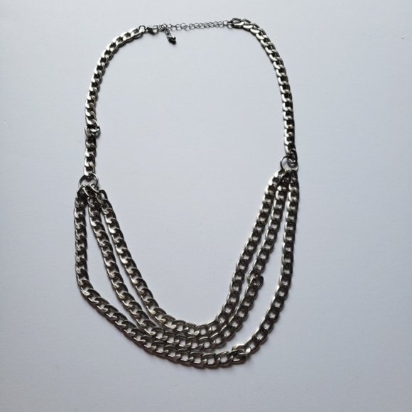 Women's silver tone alloy metal fashion multi layer statement necklace. 3 curb style chains with lobster clasp closure and extension chain for versatility.
