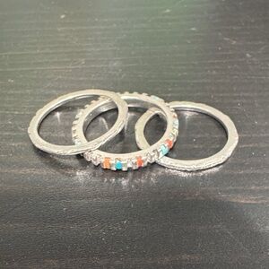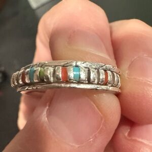 Elegant silver ring featuring a vibrant multicolor inlay. Perfect for adding a pop of color to any outfit. SOLD AS IS… many of the colored stones have fallen out but it is still a beautiful stacking ring!