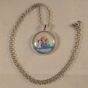 #Rainbow mermaid riding white rainbow unicorn cabochon necklace