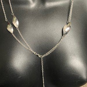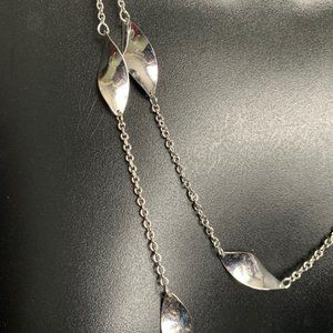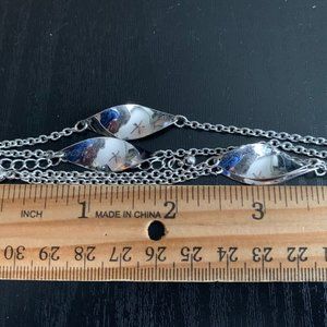 Flashy silver-tone necklace with a secure lobster-claw clasp. Inside measurement adjustable from 23" to 30" long. No idea what it's made from but super light-weight and super shiny, so may be aluminum. Pretty necklace.
