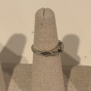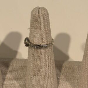 This silver ring features a stone centerpiece.
