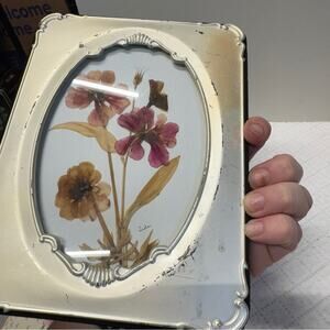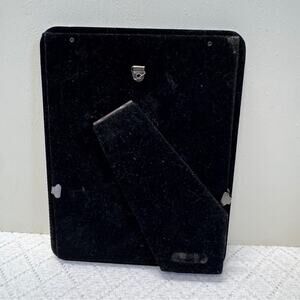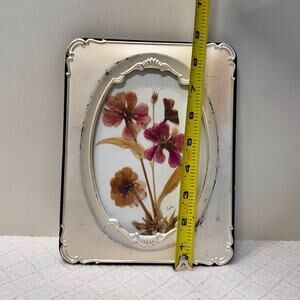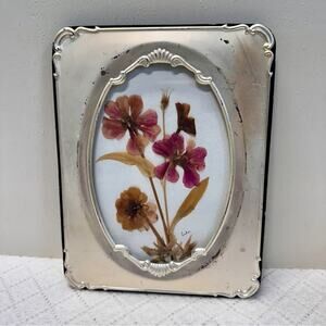 This exquisite silver picture frame features an ornate design that beautifully complements its botanical accents. The frame's elegant finish and intricate detailing make it a perfect addition to any sophisticated decor. Ideal for showcasing cherished memories with a touch of vintage charm. Has some wear to the frame.