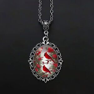 Silver Oval Shaped CARDINAL Red Bird Pendant Necklace