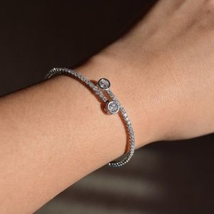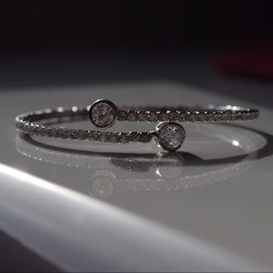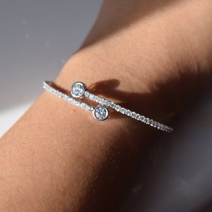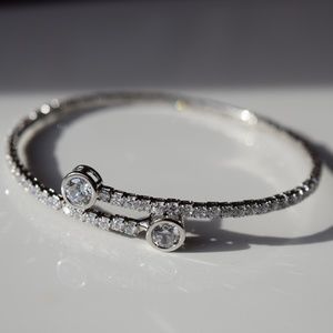A shimmering silver overlapping bracelet is a perfect edition to your closet! It fits on any wrist and is quick and easy to put on! Perfect to use on a daily basis, and adds a glamorous look to your outfit!