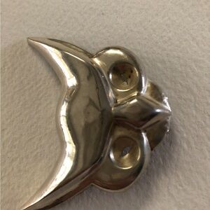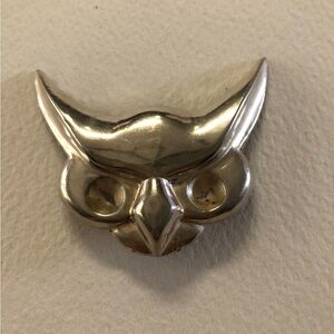 This stunning brooch is a must-have addition to any jewelry collection. Crafted from high-quality sterling silver, it features sparkling rhinestones that catch the light beautifully. The intricate design is sure to impress, making it a perfect accessory for any outfit. Whether you're dressing up for a special occasion or adding some sparkle to your everyday look, this brooch is the perfect choice. In fair condition, is missing the blue rhinestone eyes.