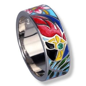 Silver Parrot Multicolor Enamel Ring and Pierced Earrings Set Ring