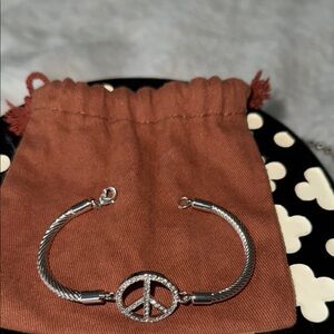 Elegant silver bracelet featuring a sparkling peace sign charm. Perfect for adding a touch of sophistication to any outfit.