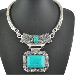 Bold statement necklace, vintage look, silver hardware, intricate design, lightweight, unique self-patterned turquoise blue/green crystal stone