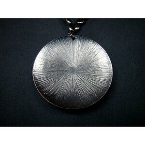 Design: The necklace has a large, circular pendant decorated with a floral and butterfly motif in a relief style. The vibrant pink color and white flower suggest a nature-inspired design, popular in various costume jewelry styles.
