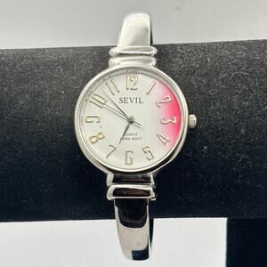 Silver & Pink Sevil Cuff Watch. Fully functional with brand new batteries. Fits 6 1/2 in wrist. N5