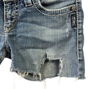 Silver Pioneer Distressed Booty Cut Off Blue Jean Shorts Raw Hem Womens 28