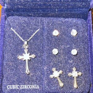Silver Plate Cubic Zirconia Cross Necklace and Stud Earring Set