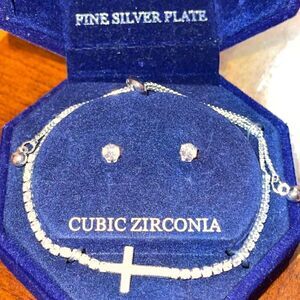 Silver Plate Cubic Zirconia Slider bracelet and Stud Earring Set