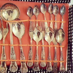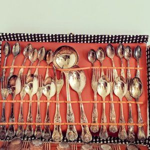 Silver Plated 51 Piece Silverware Set. Boxed 51 piece Silver Plated Cutlery set: includes 12 Knives 8-1/2" long Serrated edge, 12 forks 7-3/4" long, 12 Soup or dessert spoons 7-3/4" long, 12 teaspoons, 1 soup ladle, pair of salad servers. Pattern handles with a shell type end, all stamped LBL fp Zinc Plated Italy. All in very good condition in a fitted box which is worn from storage. Please checkout the pictures for descriptions and conditions. So you can make a decision on what you will be receiving and Thanks for stopping by! Need some cleaning from aging.
