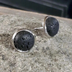 Silver Plated Domed Black Volcanic Lava Aromatherapy Cabochon Stud Earrings