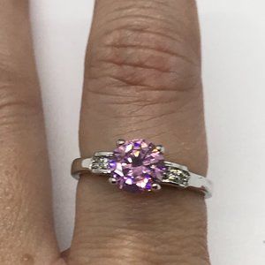 This silver plated ring is a size 8. It features a 7.4 mm round Pink cz. It also has several clear 2mm round accent cz's on the base of the ring. This ring weighs 2.6 grams.