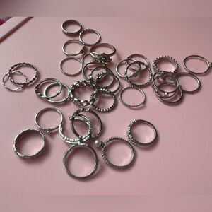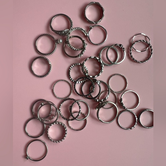 Mixed silver plated zinc alloy ring bundle featuring a variety of stackable bands and textured styles. Perfect for creating layered ring looks or mixing with your existing jewelry collection.