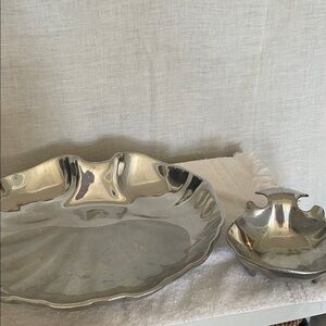 Elegant silver plated shell-shaped serving platter with a dip bowl. Perfect for entertaining.