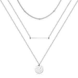 Three layers include a satellite beaded, hammered disc coin medallion & a horizontal simple bar chain.