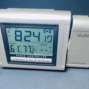 Stay on time with the Projection Clock. This sleek silver clock features radio-controlled timekeeping and a convenient projection display. Perfect for any modern space.