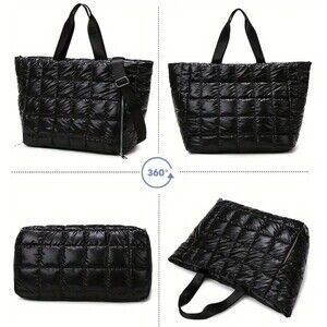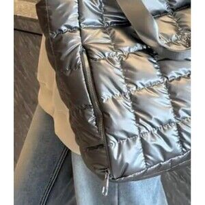 Silver Quilted Puffer Tote Bag Large Capacity Shoulder Travel Carryall